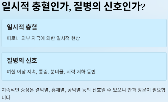 충혈이 며칠 이상 지속되거나 통증, 분비물, 시력 저하가 함께 나타난다면