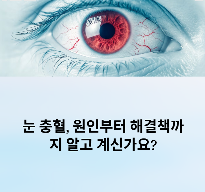 눈 충혈은 많은 사람들이 일상 속에서 겪는 흔한 증상 중 하나입니다. 하지만 원인을 모르고 방치하면 불편함이 지속되거나 눈 건강에 영향을 줄 수 있습니다. 이 글에서는 눈 충혈이 생기는 주요 원인과 함께, 병원에 가지 않고도 생활 속에서 실천할 수 있는 간단한 진정법까지 자세히 알려드립니다.