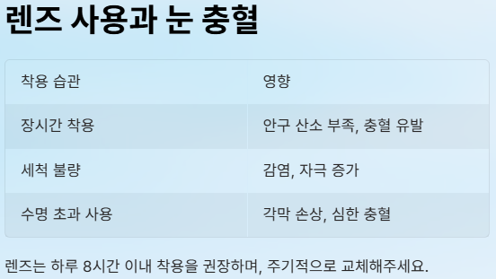 5. 눈 주위 청결 유지: 렌즈 사용 전후 손 씻기, 화장품 잔여물 제거 등 위생 관리가 중요합니다.