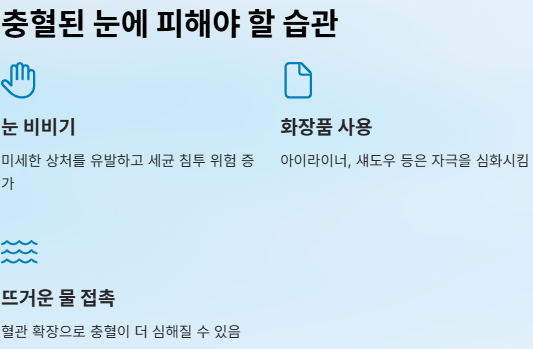 눈이 충혈됐을 때는 무의식 중에 더 자극을 주는 행동을 할 수 있으므로 주의해야 합니다.