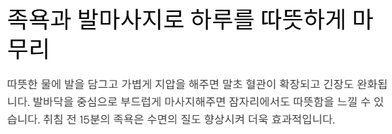 | 족욕 | 15분 | 말초혈관 확장, 피로 완화 |
