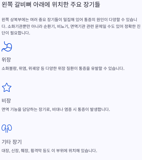 | 왼쪽 갈비뼈 아래 | 위장, 비장, 대장 일부, 신장, 췌장, 횡격막 등 |